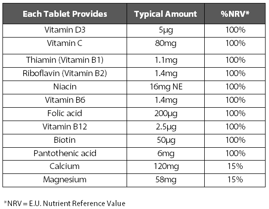 Citric Acid, Acidity Regulator (Sodium Hydrogen Carbonate), Bulking Agent (Sorbitol), Calcium Carbonate, Polyethylene Glycol, Maltodextrin, Magnesium Oxide, Ascorbic Acid, Sweeteners (Aspartame*, Acesulfame K), Nicotinamide, Flavouring, Colour (Beetroot Red), Acacia Gum, Calcium Pantothenate, Pyridoxine Hydrochloride, Riboflavin, Thiamine Mononitrate, Modified Maize Starch, Folic Acid, Sucrose, Biotin, Cholecalciferol, Cyanocobalamin.